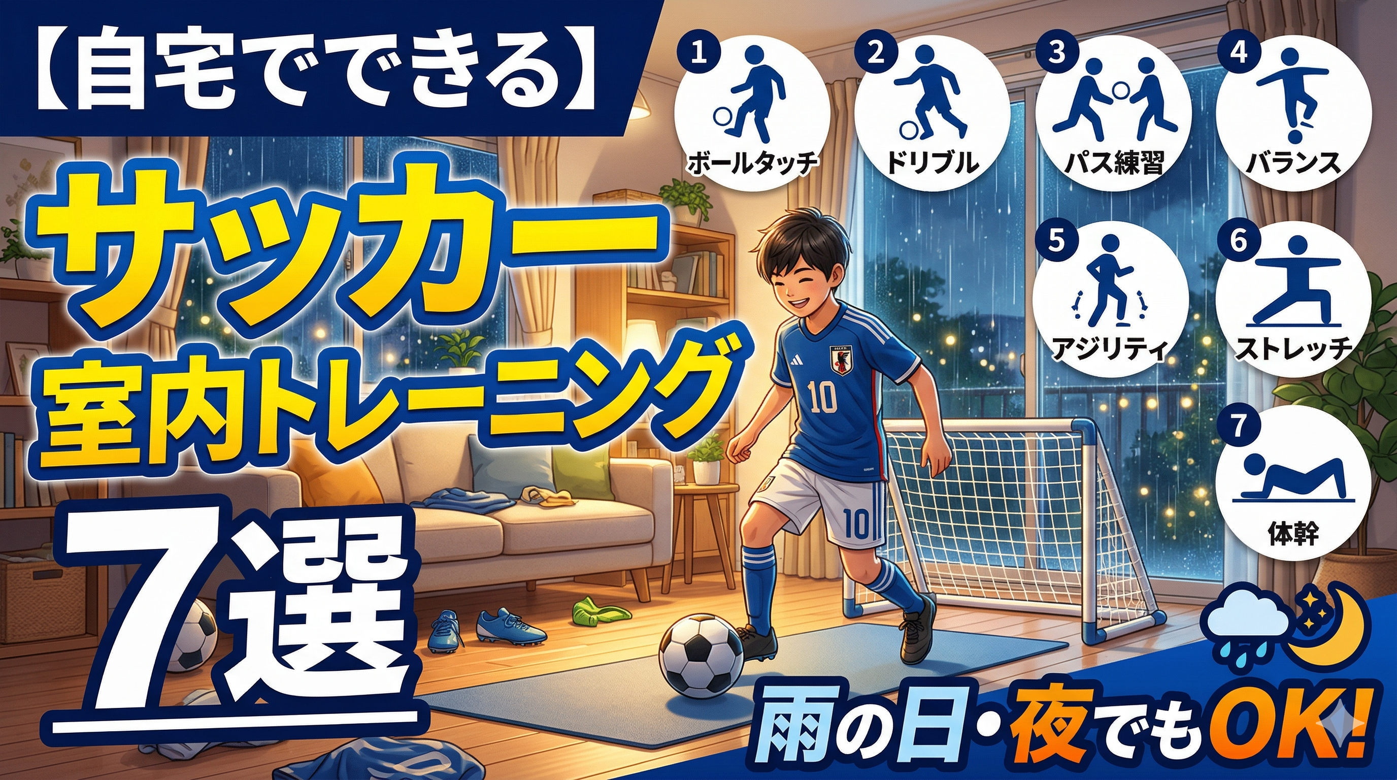 雨の日も夜も、室内でできるサッカートレーニングはたくさんあります。大事なのは「毎日ボールに触る習慣」を途切れさせないこと。