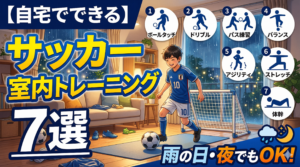 雨の日や夜でも自宅の室内でできるサッカートレーニング7選。足裏タッチ・インアウト切り替え・座ったままリフティング・プランク・ステップワーク・バランストレーニング・イメージトレーニング。畳1〜2枚分のスペースで、毎日ボールに触る習慣を途切れさせない。